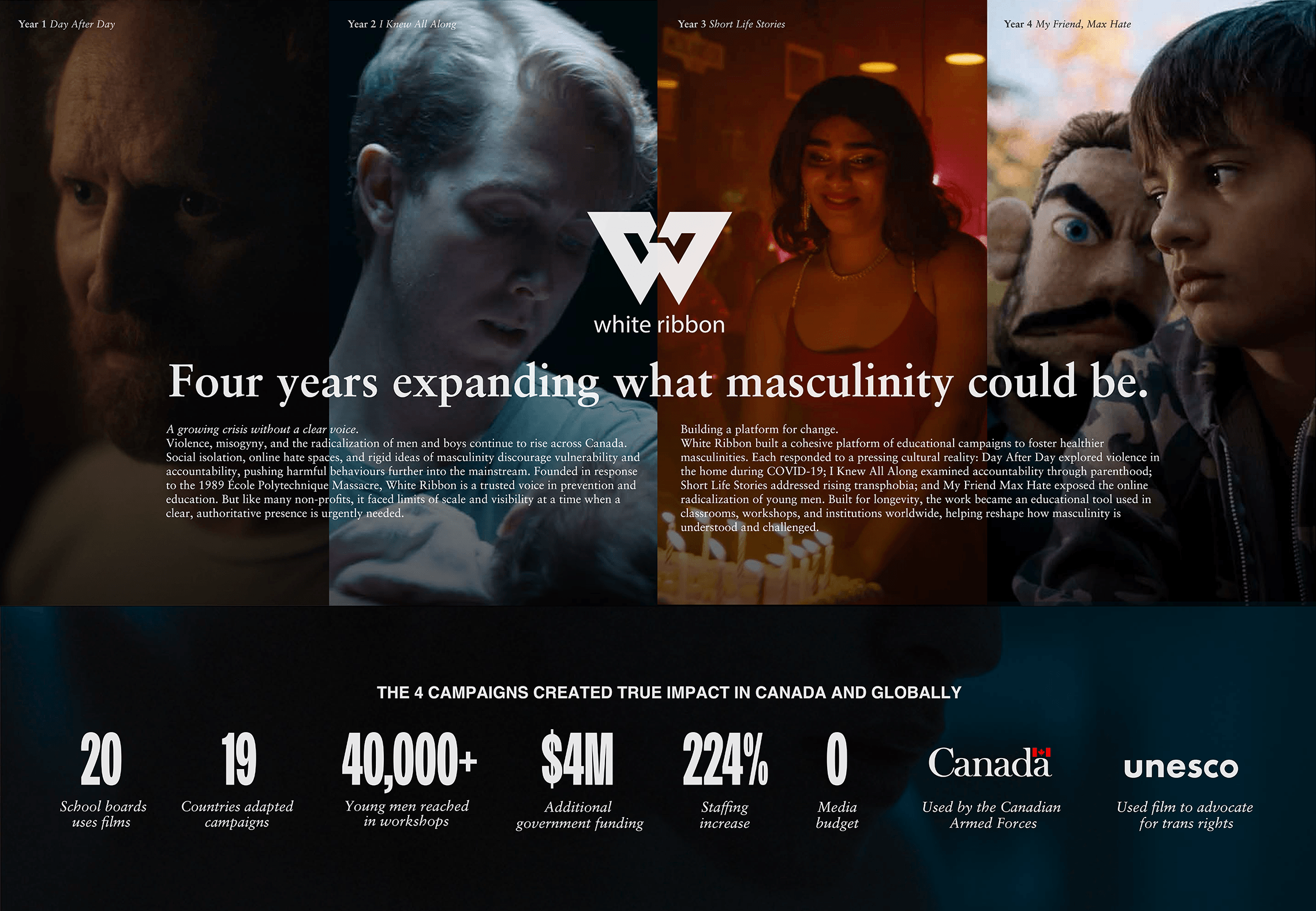 Across four films, the platform translated cultural attention into measurable educational impact. The films generated billions in reach, secured $4M in incremental funding, and moved beyond awareness into classrooms and institutions, now leveraged across 20 Canadian school boards, the Canadian Armed Forces, and UNESCO workshops. In 2025 alone it inspired 58 programs, 89 workshops, and 22 education projects across five provinces.